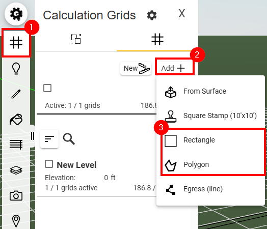 If you find some Rooms/Spaces to be missing from a Revit export, check that they exceed the 2 square meter threshold and adjust accordingly. If increasing the Room size in Revit isn't a good option, it's also possible to draw the calculation grids for the missing rooms manually, after exporting to LightStanza as shown below.